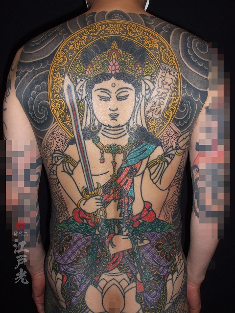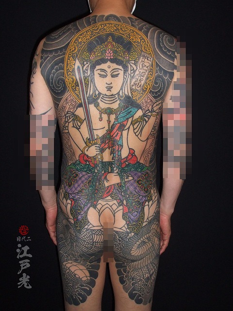 文殊菩薩の刺青、背中、和彫り、タトゥー:東京刺青師二代目江戸光