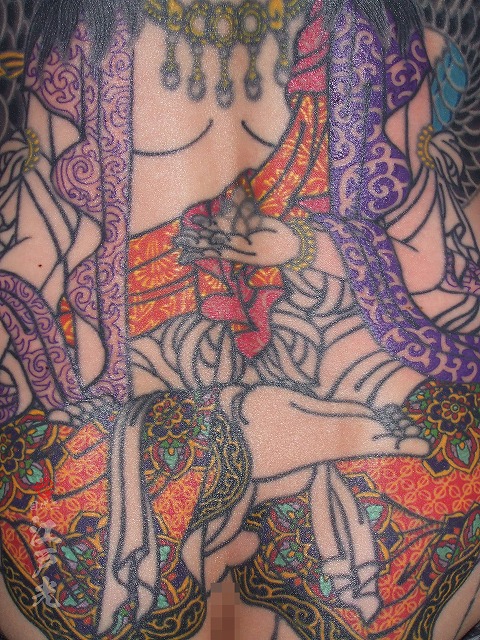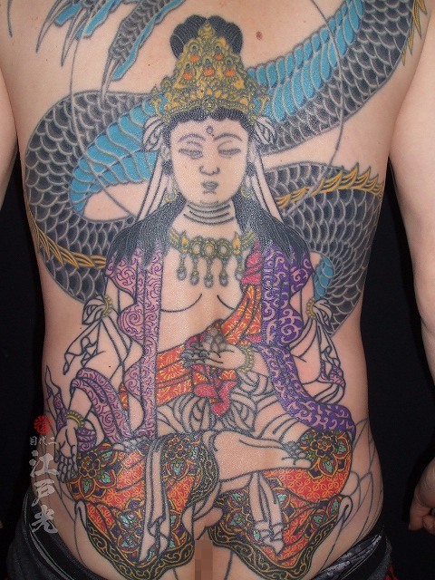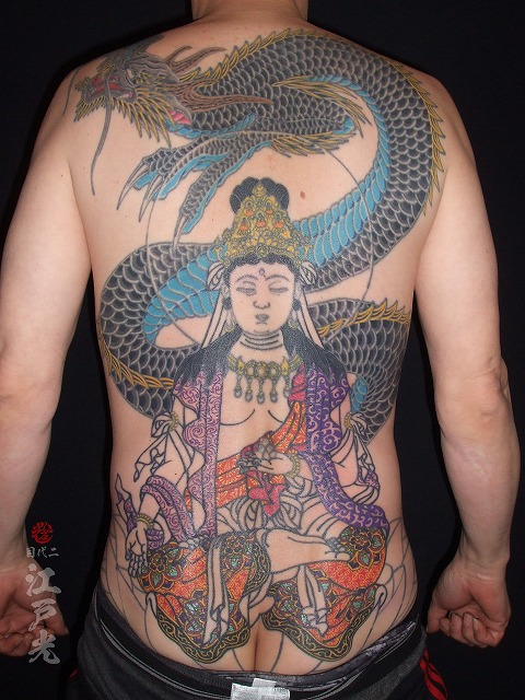 虚空蔵菩薩の刺青、背中、和彫り、着物柄、タトゥー:東京刺青師二代目江戸光