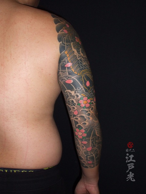 登竜門の刺青、龍、鯉、龍魚、腕、和彫り、タトゥー:東京刺青師二代目江戸光 登竜門の刺青、龍、鯉、龍魚、腕、和彫り、タトゥー:東京刺青師二代目江戸光 隠れ梵字の刺青