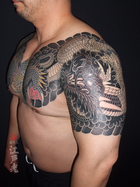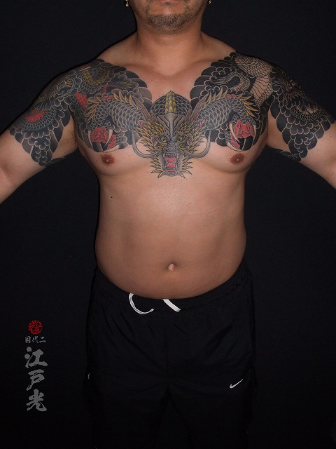 龍の刺青、腕、胸、和彫り、坐龍、正面龍、タトゥー:東京刺青師二代目江戸光