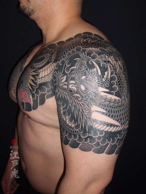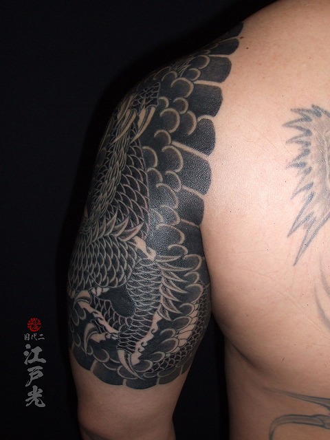 龍の色もかなり入ってきてとてもかっこいいですね。5時間も彫ってとても素晴らしい根性です。