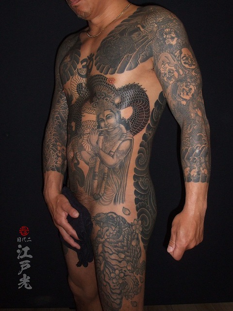 龍と蛇の刺青、和彫り、カラス彫り、どんぶり?タトゥー:東京刺青師二代目江戸光