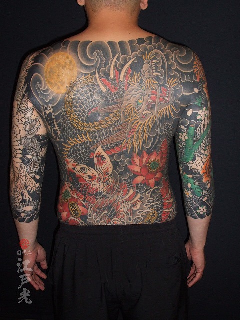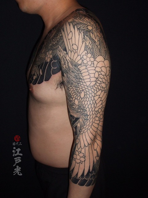 鳳凰のスジが入りました。毎回6時間も彫って本当に素晴らしい根性ですね。休まず頻繫に彫りに来て頂きありがとうございます。