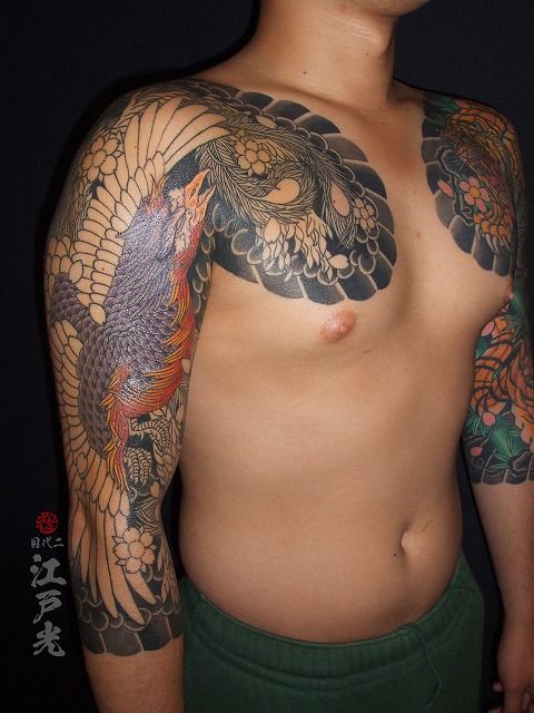 鳳凰の色が入りました。若いのにいつも休まず定期的に彫りに来て頂きありがとうございます。