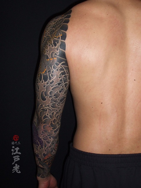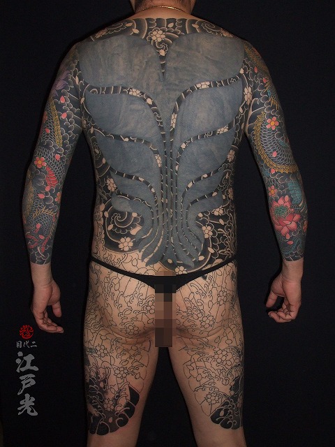 鳳凰の色が入りました。若いのにいつも休まず定期的に彫りに来て頂きありがとうございます。