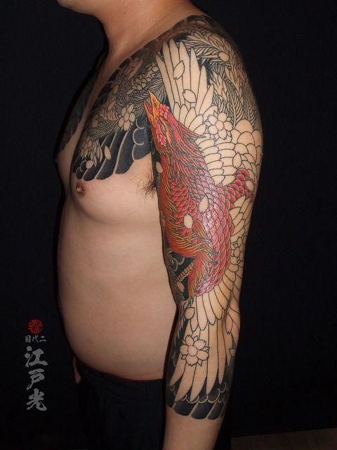 鳳凰の色が入りました。毎回6時間も彫って本当に素晴らしい根性です。