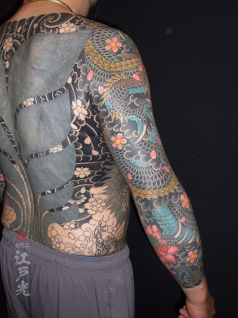雷神の衣服の柄が入りました。毎回6時間も彫って本当に素晴らしい根性です。休まず定期的に彫りに来て頂きありがとうございます。