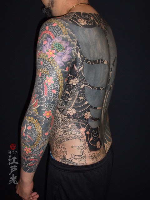 牡丹の色が入りました。いつも休まず頻繫に彫りに来て頂きありがとうございます。毎回5時間も彫って素晴らしい根性です。