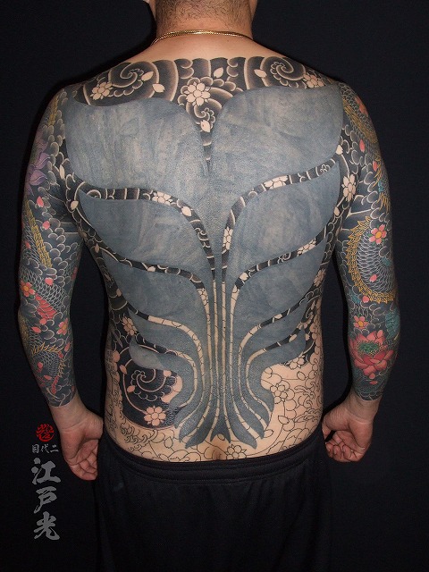 額のボカシが入りました。背中のトライバルは他店の作品です。トライバルの隙間に額が入るので、完成がどうなるのか、とても楽しみです。